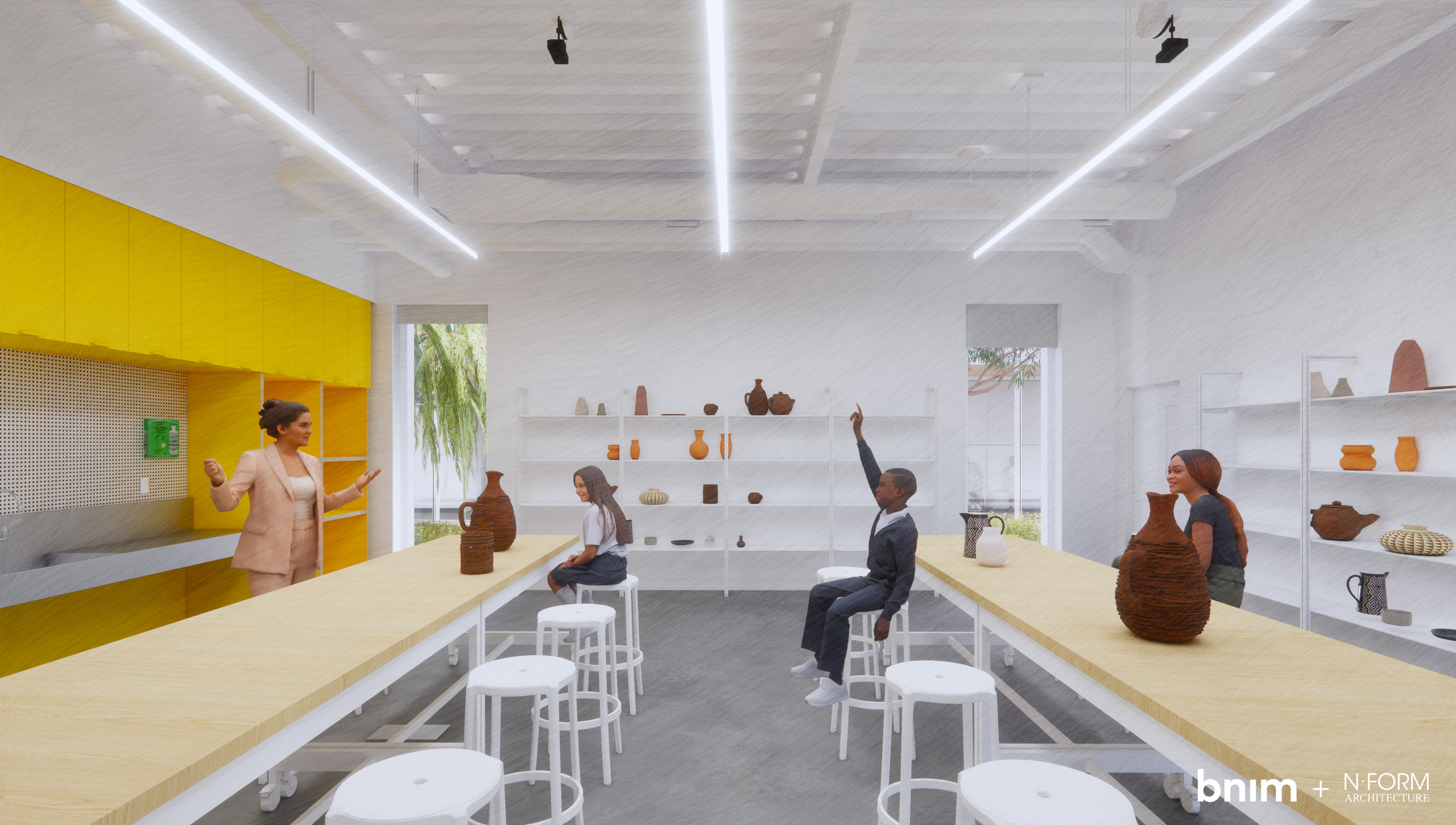 Enhancing Access: Location of the education and exhibition programs within the building were transposed to provide a more welcoming experience for the student population and to better implement equity/inclusion design goals established from re-evaluation of the master plan. In addition to providing more accessible classrooms spaces, a community room, gender-neutral restrooms, and adult changing table space were integrated into the design.