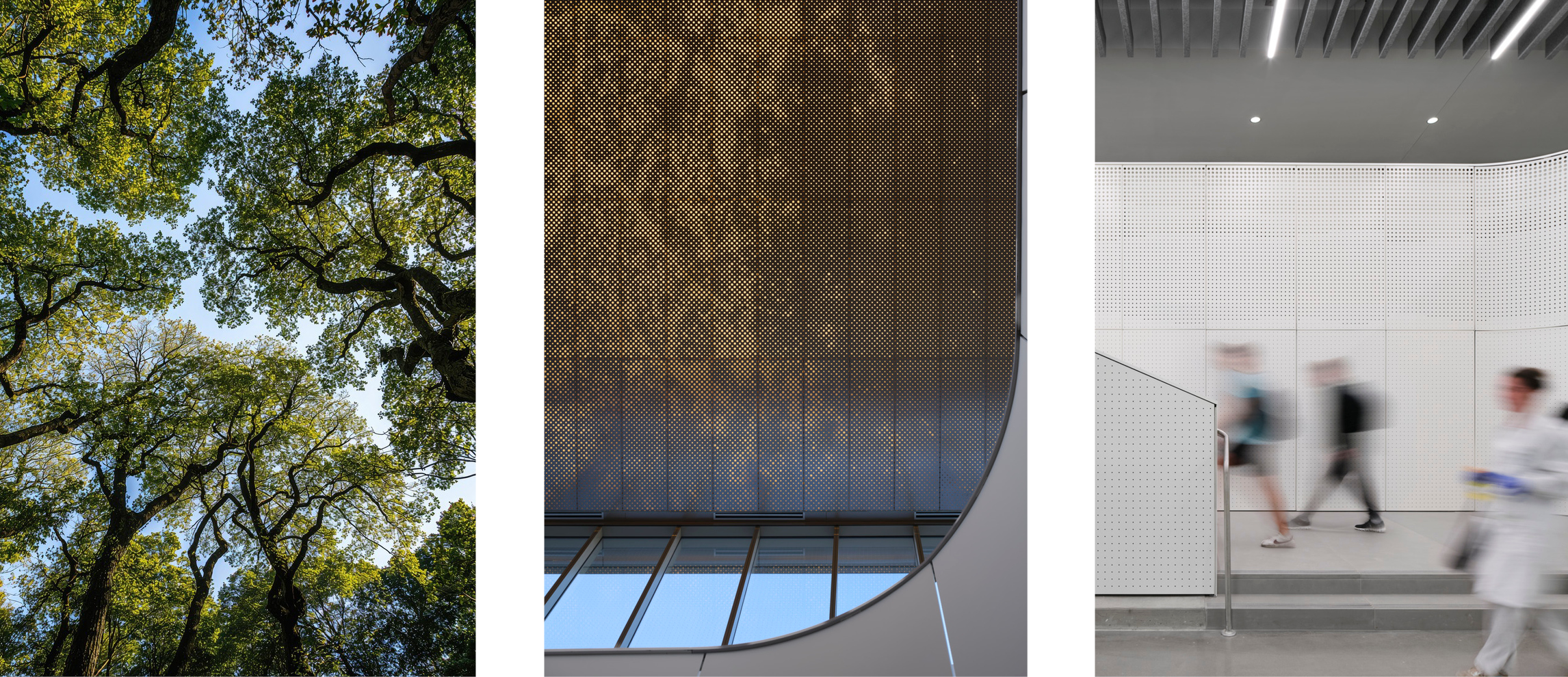 When looking up to the ceiling of the common link spaces, the perforation pattern represents crown shyness—the natural phenomenon where the top branches of the tree canopy grow apart to leave space for natural light to filter to the ground. This process allows the entire ecosystem below the trees to thrive.