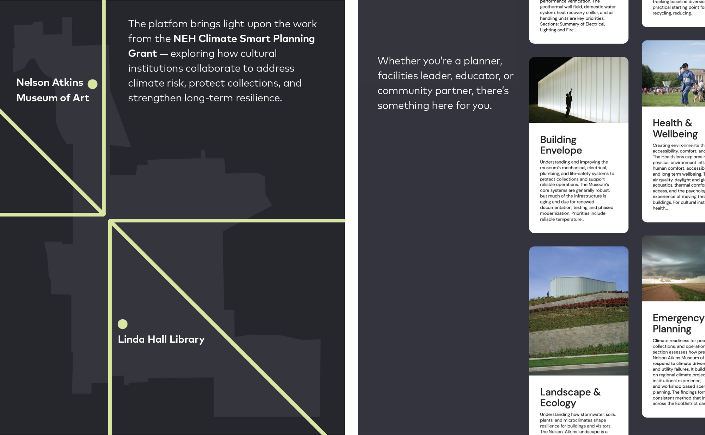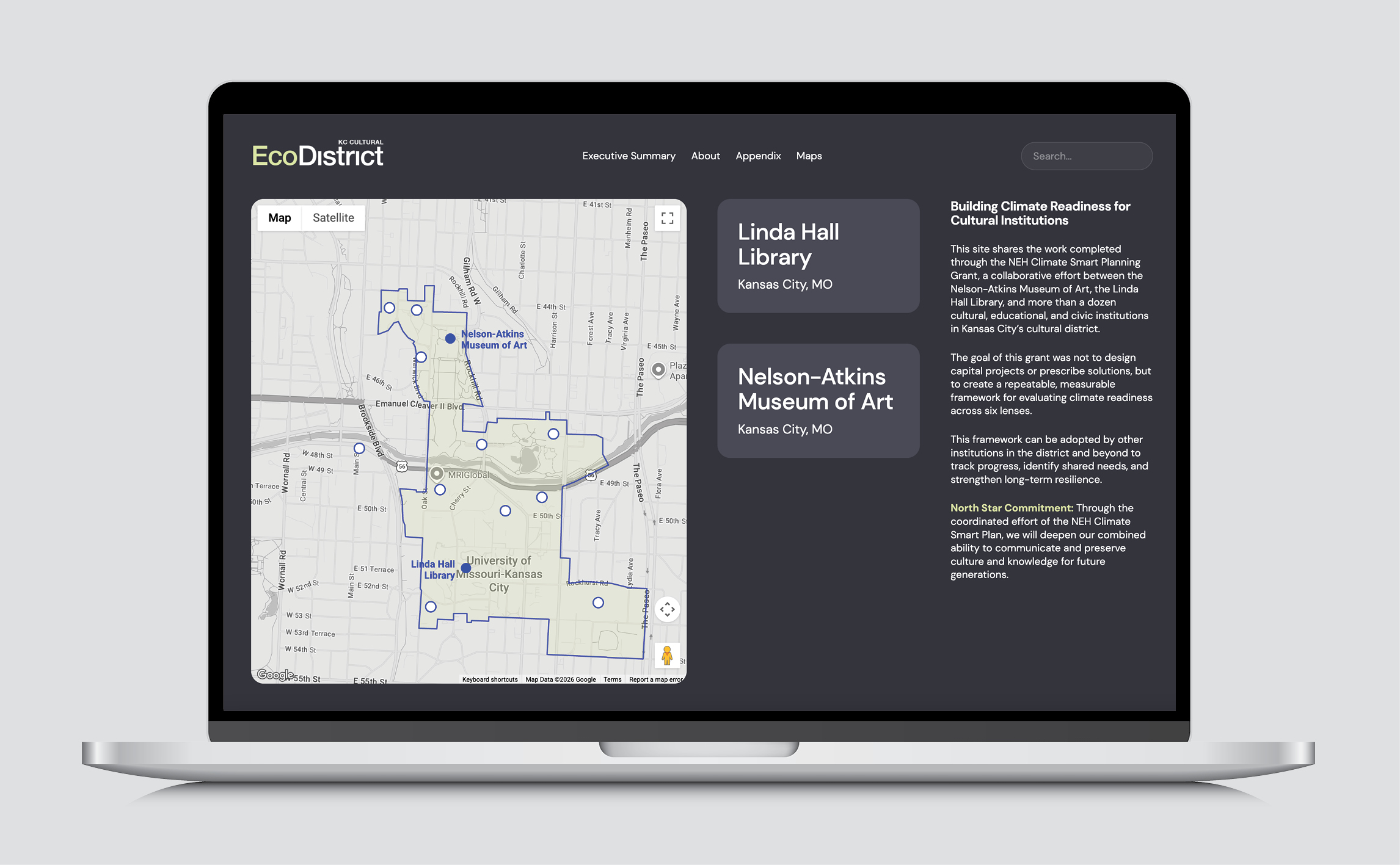 This is the North Star statement of the Kansas City Cultural EcoDistrict, a year-long collaboration between the Nelson-Atkins Museum of Art, Linda Hall Library, and a consulting team led by BNIM and GDS Engineering, with support from Armstrong Collaborative, MAC Water Technologies, and SunSmart Technologies. The EcoDistrict is a first-of-its-kind effort to help Kansas City’s most significant arts and cultural institutions prepare for future resilience, together, through shared measurement, coordinated planning, and a framework designed to be adopted by peer institutions locally and across the country. Today, BNIM shares the tools, findings, and framework from that effort at ecodistrict.bnim.com.