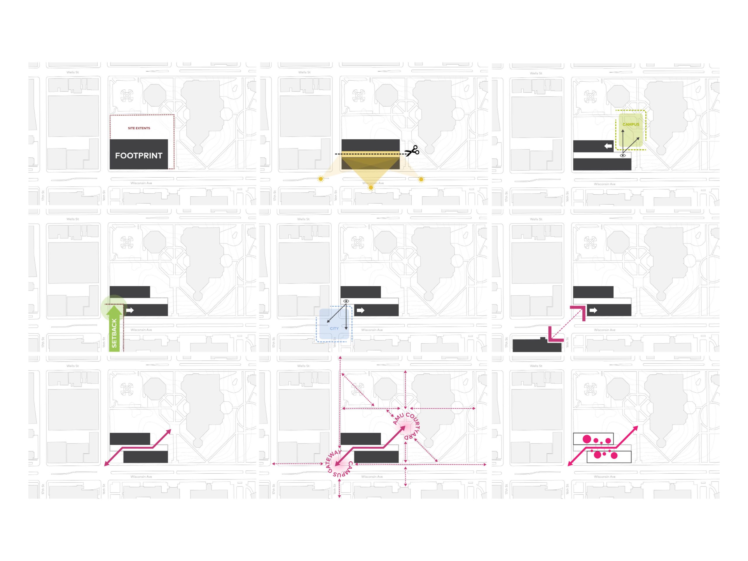 Early architectural design studies for the College of Business were informed by adjacent campus and neighborhood buildings, streetscapes, and existing urban design patterns to determine the right scale, massing, materials, colors, and textures to enhance design integration.