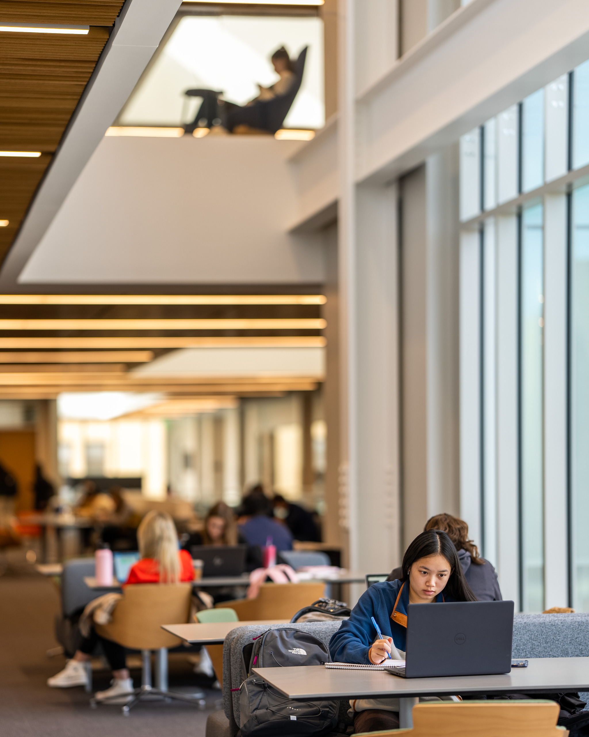 As the nature of Business is continually evolving, so must academic curriculums and the spaces that support students and faculty. It was important that the design of the College of Business be nimble and responsive to meet the current and future needs of the college. The design team approached this project with the intent that it would be equipped for changing programmatic requirements and future generations of students for years to come. As a result, the design is both “purpose-built,” responding to clear strategic vision for this facility, while simultaneously employing strategies for a “long-life, loose-fit.” Spaces are designed with flexibility in mind to adapt and respond to multi-functional needs for academic or professional development. As a project completed during the onset of the pandemic, classroom spaces are specifically designed to be to accommodate all modes of learning, from in-person to hybrid to virtual learning.