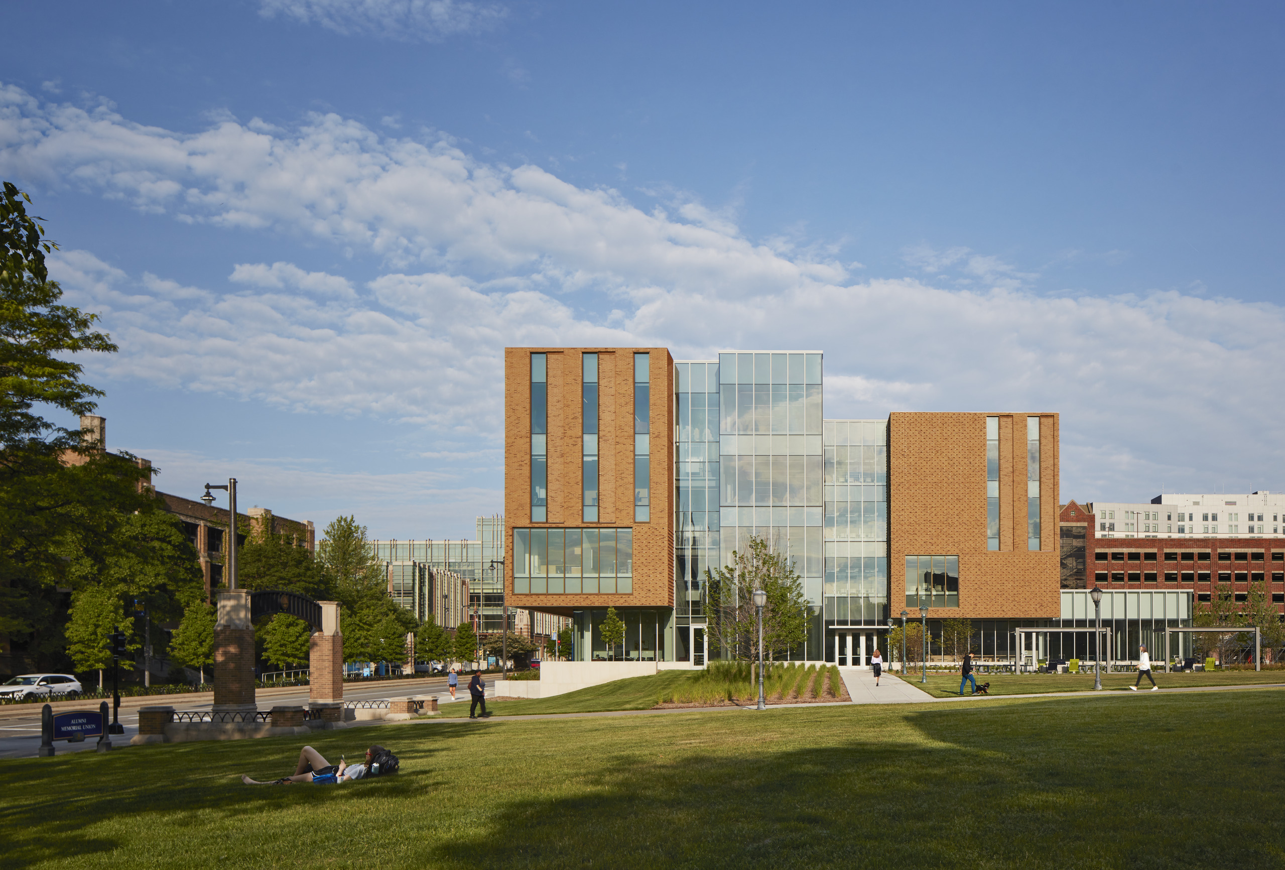 The O’Brien Hall College of Business is a transformational new facility for business education and innovation on this higher education campus. Situated at a highly visible and frequently travelled site on campus, the building was envisioned as an engaging and welcoming convening space for students, faculty, and visitors that would establish an important campus corridor between the university and the local community beyond.