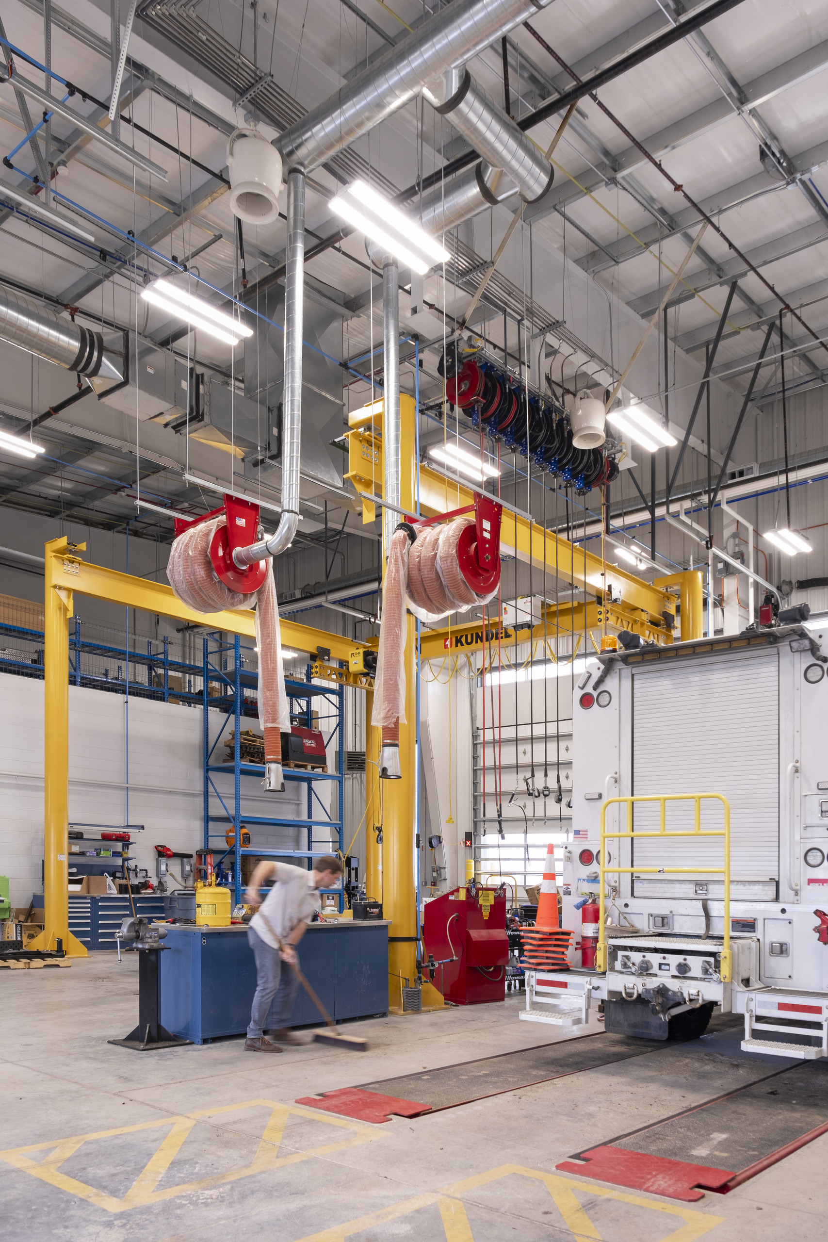 A 230-foot corridor serves as a daylit and efficient connection between the building’s programmatic areas and functions. This corridor and areas north utilize traditional steel structural assemblies, while the crew areas to the south are constructed using a preÂ-manufactured structural system.