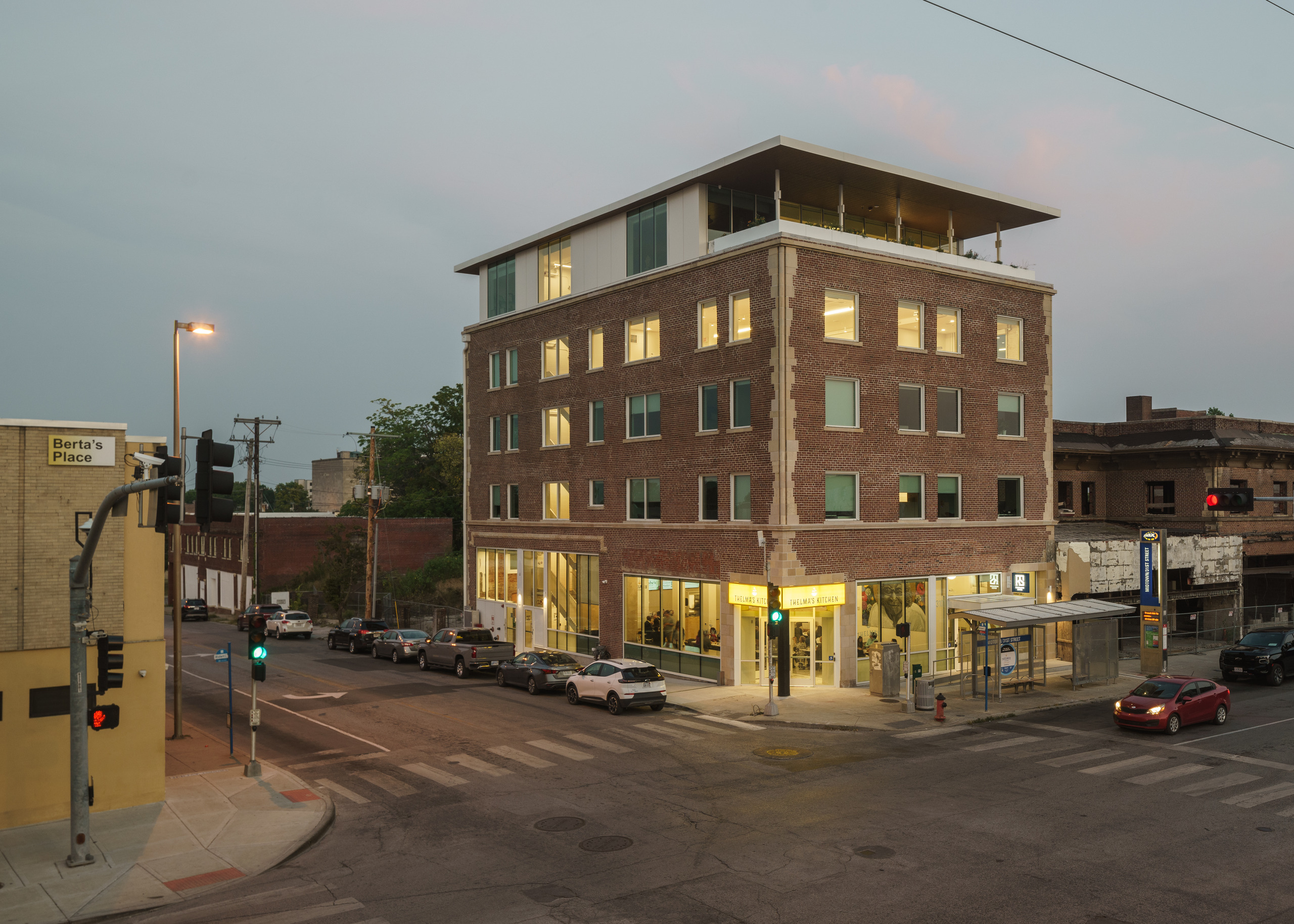 Reconciliation Services’ home at 3101 Troost was constructed around 1908 as the Westover Building, which provided office and retail space for a nascent commercial district developing along Troost Avenue. The site has a charged history. In the early 1800s, present-day Troost Avenue was a canoe trail used by the Osage Nation to reach the Missouri River. After the forced relocation of the Osage, in 1934 the surrounding land became the Rev. James Porter’s plantation, maintained by up to 100 enslaved people. At the end of the Civil War, the Porter family parceled their farmland for the country estates of Kansas City’s gilded society, whereupon the 3100 block of Troost became known as “Millionaire’s Row”. Picking up in the middle of the 1900s, white flight, redlining, and other forms of racial segregation calcified Troost Avenue into a boundary dividing Kansas City’s Black residents on its east side from the primarily white neighborhoods to its west. Today, that legacy is manifested in disparities of health, education, and income between residents on either side of Troost. Reconciliation Services’ mission confronts these disparities directly, and so it was vital for the project to manifest a whole-hearted reinvestment in this place.